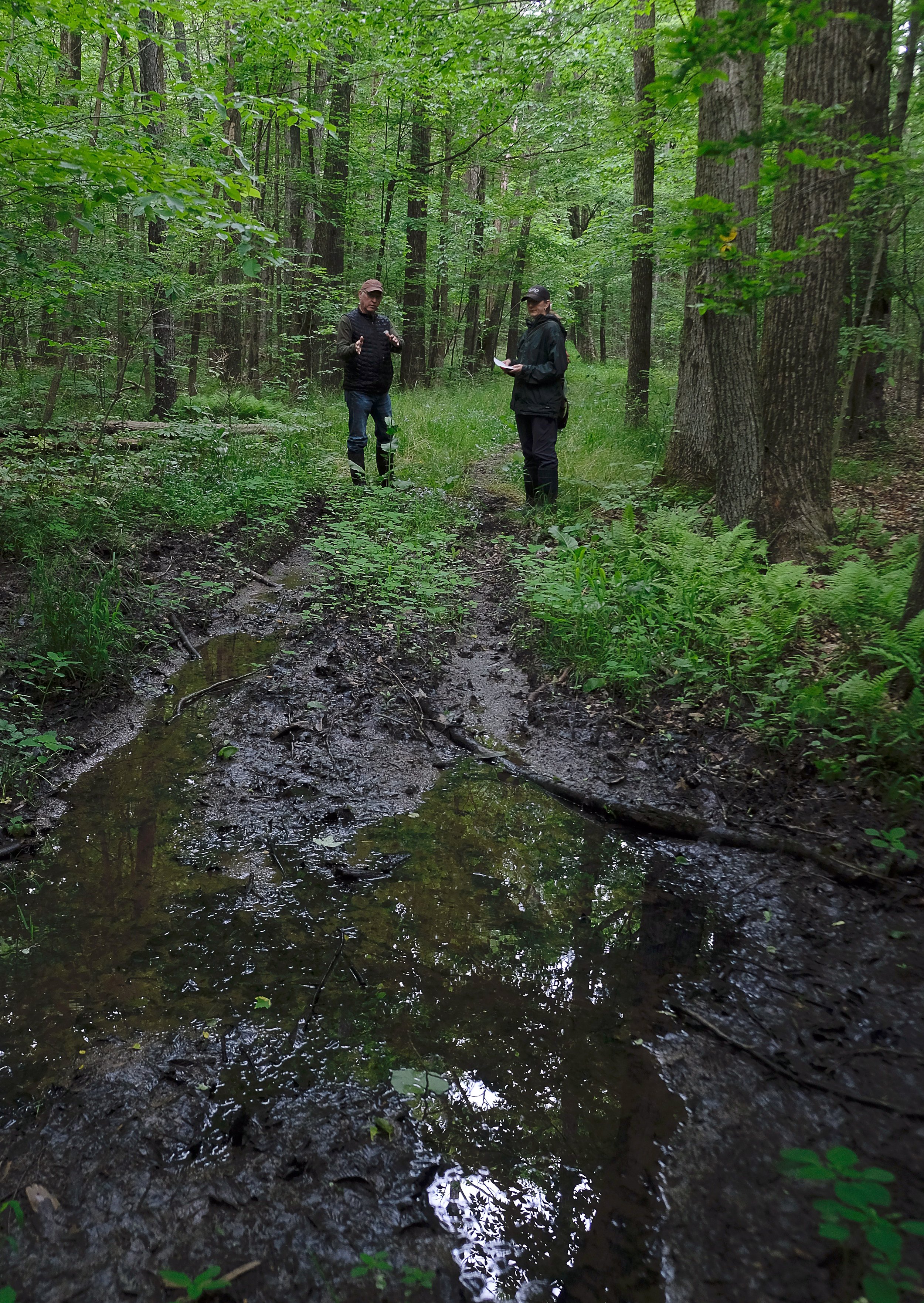 IMPACT president Glenn Gebhard and board member Nate Foster examine a badly flooded section of Trail 3 in the spring of 2025.